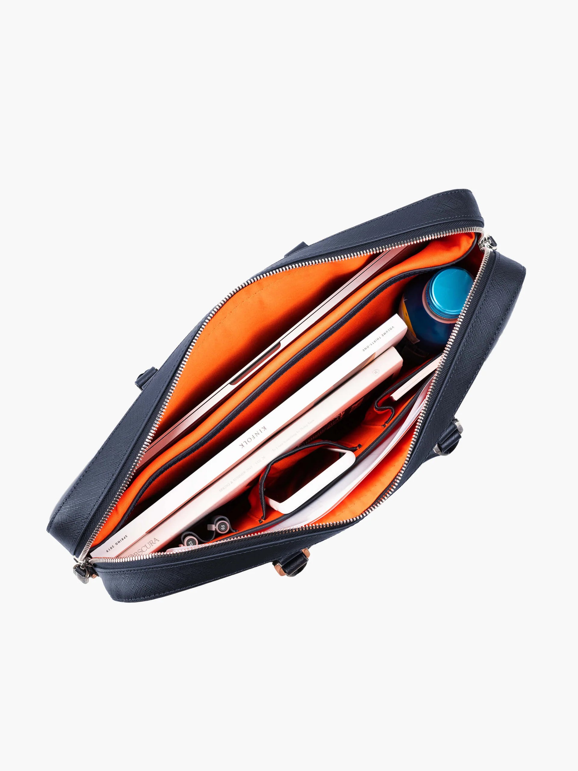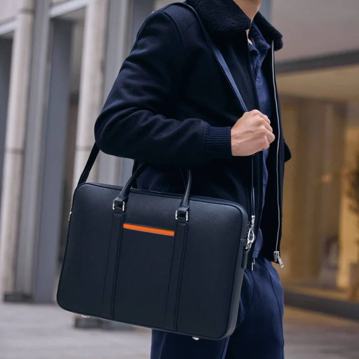 Meet our Manhattan Leather Briefcase, Main compartment with 2-way zip Padded compartment for MacBook Pro 16" 1 Open mobile phone pocket 1 Business card case pocket 2 Writing instrument slots Inner compartment with magnetic closure Adjustable shoulder straps in nylon and Saffiano leather Shoulder strap made after Jun 2024 has been upgraded with shoulder pad
